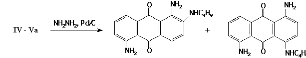 0.1 g of the IVa (Va) in 20 ml of ethanol was reduced by hydrazine hydrate in presence of 0.1 g Pd/C. After the initial products were transformed, the solution was filtered while being hot. The filtrate was diluted with water, and 1,5-diamino-2(4)-butylaminoanthraquinone was isolated.
