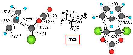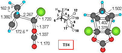 Mulliken population analysis, which gives a qualitative indicator for the amount of electron density shared by two atoms, provides some evidence for secondary orbital interaction between the two reactants, to rationalize observed specificities. It was employed successfully by Houk et al. to explain stereoselectivities in Diels - Alder reactions [23]. In TS3 the H7aC9 (RHF/6-31G* values) overlap density has a negative value of -0.004, indicating a repulsive interaction betwen the carbonyl p-system and the methylene bridge hydrogen. The H7aO8 is much smaller, and the H7aO10 interaction is negligible. Furthermore, the C5Cl12 electron density value of -0.007 also indicates negative secondary orbital interaction. Furthermore, the C7O8 overlap density has a negative value of -0.001, indicating a repulsive interaction betwen the carbonyl oxygen lone pair and methylene bridge carbon. The C7C9 density is much smaller. All these interactions destabilize the exo- mode of approach of cyclopentadiene. In TS4 where DCVC approaches cyclopentadiene in the endo- fashion, the H7aCl12 and C7Cl12 overlap populations are attractive with values of 0.002 and 0.003, respectively. Furthermore, the C5O8 overlap density has a negative value of -0.006, indicating a repulsive interaction (p - n), while the stabilisation of the endo- structure can be explained by the C5C9 and C5O10 stabilizing secondary orbital interactions between diene and carbonyl p- system.