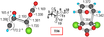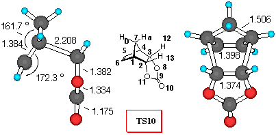 If we employ the same analysis of secondary orbital interactions, as in the DCVC+CPD case, we can find that the dominant orbital interactions in TS6 are O7C9, with a positive value for the overlap density of 0.04 (carbonyl p- system and oxygen lone pair atraction). Also, the O7O8 overlap density has a value of 0.002, indicating attractive lone pair - lone pair interactions. Similarly in TS4, the C5O8 overlap density of TS7 has a negative value of -0.004, indicating a repulsive interactions (p - n), while the stabilisation of the endo- structure can be deduced from the C5C9 and C5O10 stabilizing secondary orbital interactions between p- orbital of diene and carbonyl p- system.