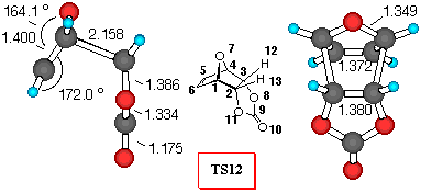 In this reaction, we can find that dominant orbital interactions in TS9 are O7C9, with a positive value for the overlap density of 0.05 (carbonyl p- system and oxygen lone pair attractions). Also the O7O8 toverlap density has a value of 0.003, indicating attractive lone pair - lone pair interactions. Similarly to the TS7, the C5O8 overlap density of TS12 has a negative value of -0.003, indicating repulsive interactions (p - n), while the stabilisation of endo- structure can be deduced, as in the previously discussed endo- adducts from the C5C9 and C5O10 stabilizing secondary orbital interactions between p- orbital of diene and carbonyl p- system.