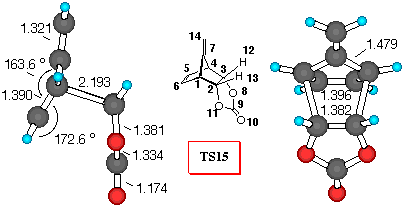 In this reaction, we find that the dominant orbital interactions in TS14 are between C7C9, with a positive value for the overlap density of 0.05 (p- p attractions). Also C7O8 the overlap density has a negative value of 0.002, indicating repulsive p- lone pair interactions, which may destabilise the exo- TS. As in all the other cases examined, the C5O8 overlap density of TS15 has a negative value of -0.003, indicating repulsive interactions (p - n), while the stabilisation of endo- structure can be deduced, from the C5C9 stabilizing secondary orbital interactions between the p- orbital of diene and the carbonyl p- system.