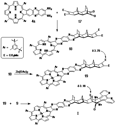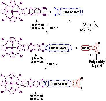 to fuse the porphyrin (via porphyrin diamine 4a) and ligand moieties (by cycloaddition) site specifically onto the spacer framework.
