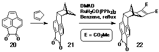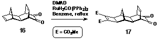 Molrac dione 16[15] (540 mg, 2.7 mmol) was dissolved in benzene (40 ml) with excess dimethylacetylene dicarboxylate (1 mL, 1.15 g, 8.1 mmol) and RuH2CO(PPh3)3 (125 mg, ~5 mole %). The solution was heated at 80oC for two days under argon. Removal of the solvent yielded a brown oil, which was washed through a plug of silica with 2% methanol/CHCl3. The eluted material was further purified by column chromatography on silica by elution with CHCl3. Combined fractions were evaporated to dryness to give a yellow oil which crystallised on standing. Yield: 436 mg, 47%. 1H NMR (300MHz, CDCl3) d 1.11 (1H, d, J = 12.1 Hz); 2.07 (2H, s); 2.14 (1H, d, J = 12.1 Hz); 2.47 (2H, s); 2.72 (2H, s); 3.63 (2H, m); 3.78 (6H, s); 6.38 (2H, m).