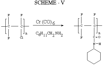 Reaction of PCTFE with Cr(CO)6 in the presence of cyclohexylamine in DMF at 80C affords a dark product. IR analysis (Figure II) is consistent with formation of the amide as outlined above in Scheme V. Similar results are obtained with other amines such as benzylamine . Since the reactions are analagous, a detailed study of the cyclohexylamine reaction will be described.