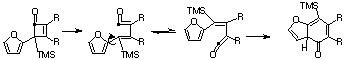 Photolysis of U results in a carbene, which undergoes a 4n [1,2] sigmatropic shift (the Wolff rearrangement) to give the ketene V. This undergoes a p2s + p2a cycloaddition (Mobius transition state) with the alkyne to give the cyclobutenone W, which in turn opens by an electrocyclic 4n reaction (Mobius transition state) to give either X (conrotation in one direction) or XÕ (conrotation in the other direction). Only X is capable of further 4n+2 electrocyclisation (Huckel transition state) to give Y, which then tautomerises to give the phenol Z. For more details, see R. L. Danheiser et al, J. Am. Chem. Soc., 1990, 112, 3093.