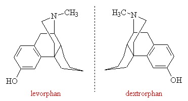 The fact that painkilling activity depends greatly upon the exact geometry of the molecule is strikingly illustrated by the drugs levorphan and dextrorphan. They are very similar in structure to morphine, except that they are both mirror images of one another. The left-handed molecule, levorphan, is several times more potent than morphine and is strongly addicting. But the right-handed molecule, dextrorphan, has no analgesic ability and is non-addicting. This is also true for morphine, which is naturally left-handed. There is no naturally occurring right-handed form of morphine, but the Japanese chemist Kakuji Goto has synthesised it and found that it possesses none of morphine's biological properties.