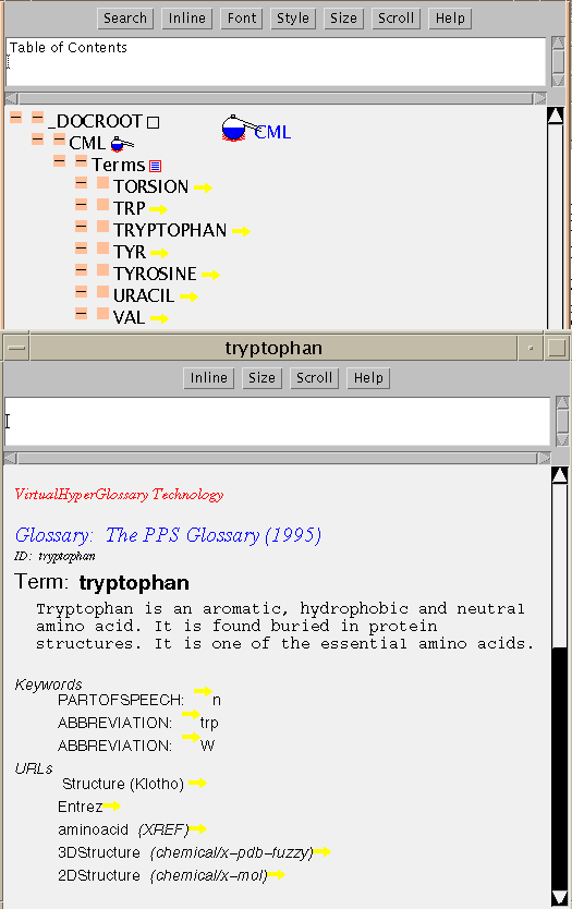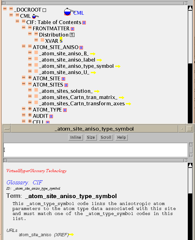 The International Union of Crystallography (IUCr) has sponsored the development of a set of dictionaries (a combination of glossaries and data dictionaries). Here is a demo of the Core dictionary (1993 version). The glossary consists of about 240 terms organised into categories, and a short Java/CML program has parsed this into a table of contents (ciftoc.cml). The main body of this is a list of terms arranged under categories (XLIST is used to contain each group). However the terms are not part of the document, but are separate as in a typical entry: ( atom_site_aniso_type_symbol.cml). Looking at this you will see that its components are XVARs, with an XHTML for the definition, and some ADMIN nodes. The key components are the ID and TERM (held in XVARs) and the definition (held in XHTML). The owner of the entry ("sourceIdentifier") is held in an ADMIN node.