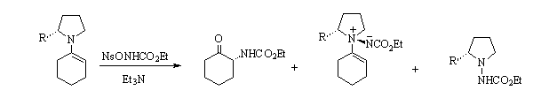 The best ee (77%) for the N-substituted a-amino ketone was registered with R = CH2OMe. The configuration of the major enantiomer was R. Using N3CO2Et we obtained the same substituted ketone, in better yield but with a lower ee (35%). The configuration of the major enantiomer was S 1.