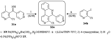 On the other hand, palladium-catalysed cross-coupling of 4-iodopyridines 31d-f,h with ortho-pivaloylaminophenylboronic acid (37) under Suzuki's conditions afforded 4,5-disubstituted benzonaphthyridines 32. Cyclization of the intermediary 4-phenylpyridine often but not always, occured spontaneously under the basic conditions of the coupling reaction.