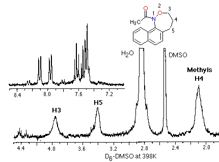 In the low temperature NMR spectra of benzoyl derivatives (1)-(3), and particularly in the 8-methylderivative (3), a second low temperature conformer is evident. A low temperature COSY spectrum at 220K is shown below and satellite resonances for axial and equatorial hydrogens of the oxymethylene ( d3.75 and d4.05) as well as the benzylic methylenes ( d3.05 and d2.80) are evident and correlated through the methylene at C4.