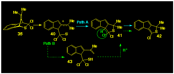 Path A involves the initial formation of a "tight" ion pair 40, subsequent bonding to the benzylic position (pseudo 1,3migration) to form the dichloro compound 41 and elimination of the HC1 from this intermediate to yield the chloro compound 42. Path B involves a mechanism similar to that proposed for the ring-opening of the diazo compound 12 to form 13 to yield the indene intermediate 43. Subsequent acid-catalysed cyclization of this thiol again gives the intermediate dichloro compound 41 which loses HC1 to yield the observed product 42.