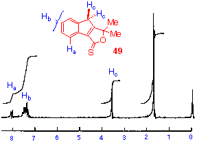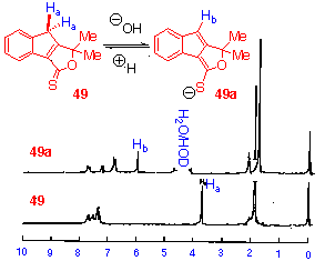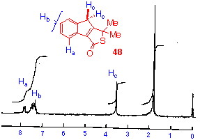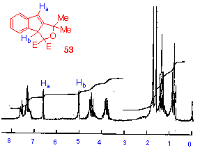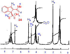 The p.m.r. spectrum of the minor product also shows a lowfield resonance at d 6.58, again suggesting the presence of the indene nucleus. In this molecule however, this signal shows a coupling of 1.5 Hz to the resonance at d 5.00. By analogy with the alcohol 54, and the extent of this coupling, the resonance at d 5.00 is assigned to a benzylic methine proton. The fact that coupling exists, indicates the planar arrangement of the two benzylic protons suggesting that the indene 5membered ring is puckered. Since the other signals in the spectrum are consistent with a nonplanar structure, the structure 53 was assigned to the minor product. This structure was confirmed by the observation that in acidic, neutral or basic aqueous solution, the compound 54 was irreversibly converted to the alcohol 54.