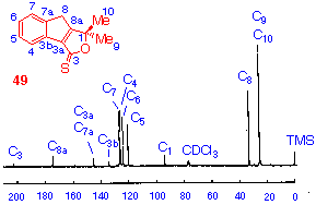 The assignments of the methyl and methylene carbons, C9, C10 & C8, are readily made on reference to proton coupled spectra. C1, the only saturated quaternary carbon is also easily assigned to the highfield quaternary signal as illustrated. The remaining signals are assigned on the basis of their observed shift when the spectra of the two isomers are compared. The signal undergoing the greatest downfield shift is assigned to C3a, the carbon adjacent to C3. The greater geffect of the thione function results in an upfield shift of the resonances of the two carbons g to C3. The two signals which show an upfield shift are thus assigned to C8a and C3b. The lower field signal is assigned to C8a on the basis of its shorter relaxation time (more intense signal) [26]. C7a is thus assigned to the remaining quaternary resonance. The remaining signal which undergoes a shift is assigned to C4. The other three aromatic signals cannot be assigned with certainty, but following the trend that the C8a and C7a signals appear downfield from the C3a and C3b signals respectively, C7, C6 and C5 are tentatively assigned as shown.