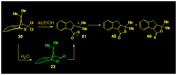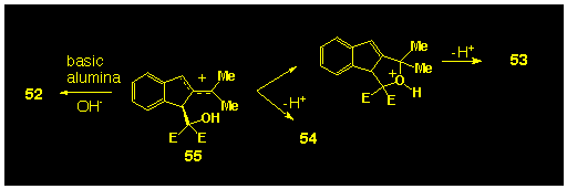 The diol 52 is considered to be derived from the addition of water to a species such as 55. It is significant to note that in the current study, the diol 52 is the only compound isolated, to date, in which an external nucleophile has attacked a benzylic carbon atom. This must result from a heterogeneous reaction occurring on the alumina surface. However, the mechanism of this hydration is obscure and has not been pursued further.