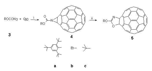 This series of experiments demonstrated unequivocally that decomposition of azidoformate 3a (Scheme 2, the suffix a, b or c will always refer to the groups shown in this Scheme) at 147°C in TCE in the presence of C60 produces a closed 6,6-bridged aziridino[2',3':1,2][60]fullerene 4a. We argued that this product arose by singlet nitrene addition to C60. Moreover, it was found that further heating of 4a resulted in a quantitative rearrangement to isomeric 3-(2,4,6-tri-tert butylphenyl)oxy oxazolo[4',5':1,2] [60]fullerenene 5a with both O and N vicinally bound to the fullerene skeleton at a closed 6,6-junction. Such findings exemplified the possibilities of being able to carry out chemical manipulations of functionalities on the fullerene surface.