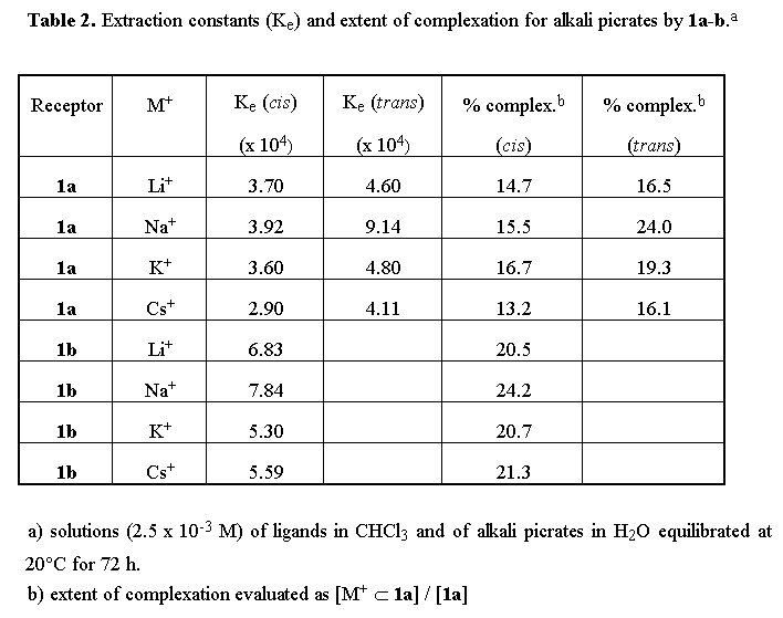 The extraction properties of 1a-b were investigated under liquid-liquid and solid-liquid two phase conditions by using alkali picrates as substrates and measuring by UV-Vis the amounts of picrate in the organic phase; results and experimental conditions are reported in Tables 2 and 3 respectively.