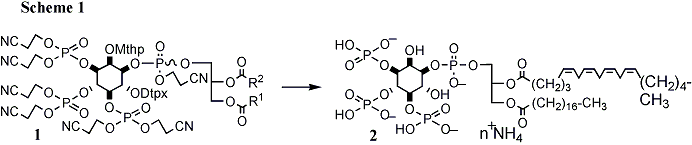 This approach has none of the limitations of earlier hydrogenolytic deprotection strategies, derived from classical carbohydrate chemistry - particularly incompatibility with poly-unsaturated acyl chains (e.g. arachidonoyl, C20:4), phosphorothioates (which are often refractory to phosphatases) or heteroatom groupings (e.g. thiols and azides). Consequently, this research led to the first synthesis of nature-identical mammalian sn-1-stearoyl-2-arachidonoyl phosphatidyl-D-myo-inositol 3,4,5-triphosphate [2, PtdIns(3,4,5)P3] and its diastereomers. These synthetic derivatives provided the first demonstration of the significance of the structure of the fatty acid tails in the phospholipids of the PI-3K growth factor signal transduction pathway (in collaboration with D.Alessi, Dundee University) and were successfully sold commercially to the research community (through Alexis Corp.). Apart form the necessary development of a new general method for the preparation of differentially substituted 1,2- and 2,3-diacyl-sn-glycerols, I also prepared dilinoleoyl (C18:2) phosphatidylinositol 3,4,5-triphosphorothioate and poly-unsaturated phosphatidyl cholines using this approach.