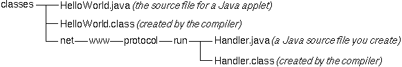 Create the directory structure shown in the figure above: classes/net/www/protocol/run.By convention, the directory structure starts with a directory named classes. The next three directories must be named as shown (net/www/protocol). The final directory must have the same name as the protocol (without the trailing ':'); in this case, this is run.