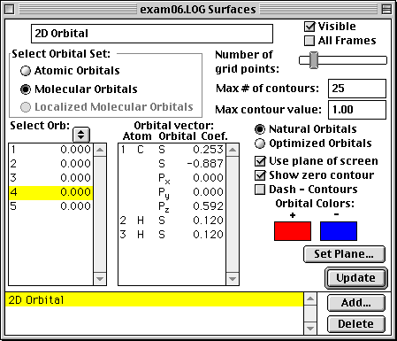 The bonds window allows you to add or delete bonds or change the bond type. The bond type has no signicance to MacMolPlt other than the color and pattern used to display the bond. The color and pattern for each bond type can be modified in the Preferences window.