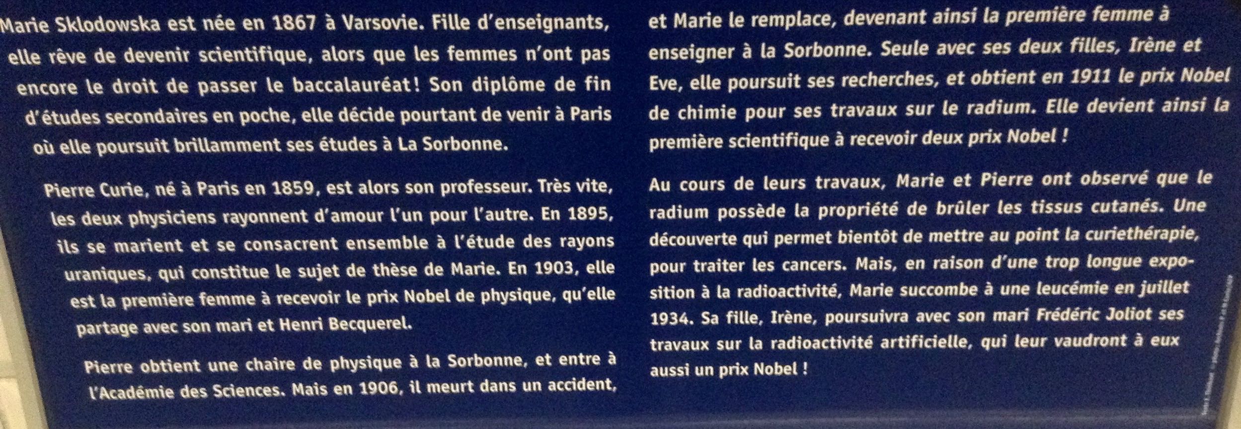 The Curies have a crypt all to themselves (VII), and other great french scientists such as Bertholet and Langevin as well as mathematicians such as Lagrange who are also interred in other crypts. It is surprising in fact how exclusive admission to the Pantheon is (and how much space for new tombs there still is); whilst many of the graves relate to famous soldiers dating from the french revolution and not a few politicians of course as well as famous literary figures, science and chemistry are very well represented! The French have even named a metro station after the Curies …