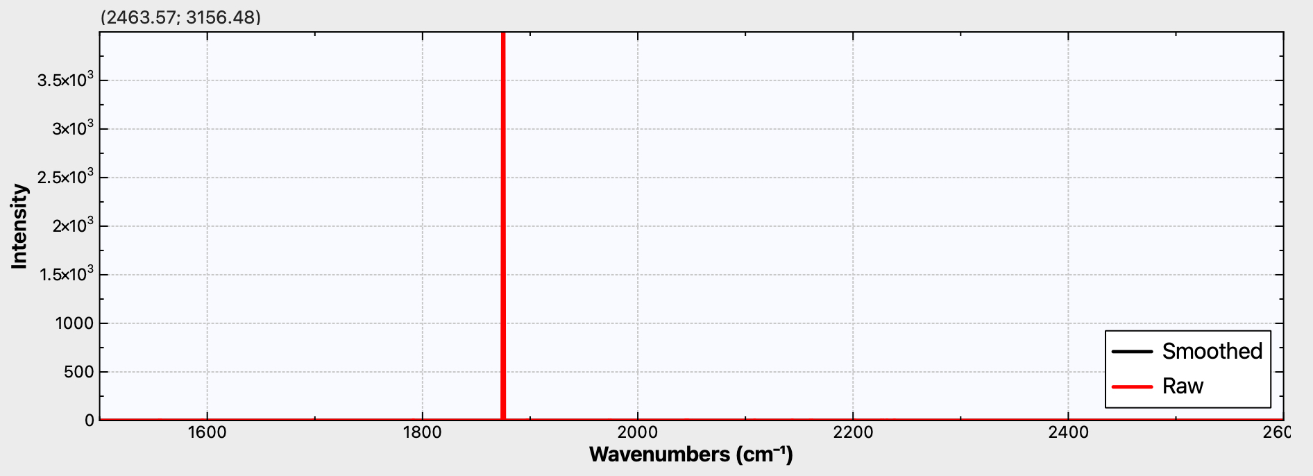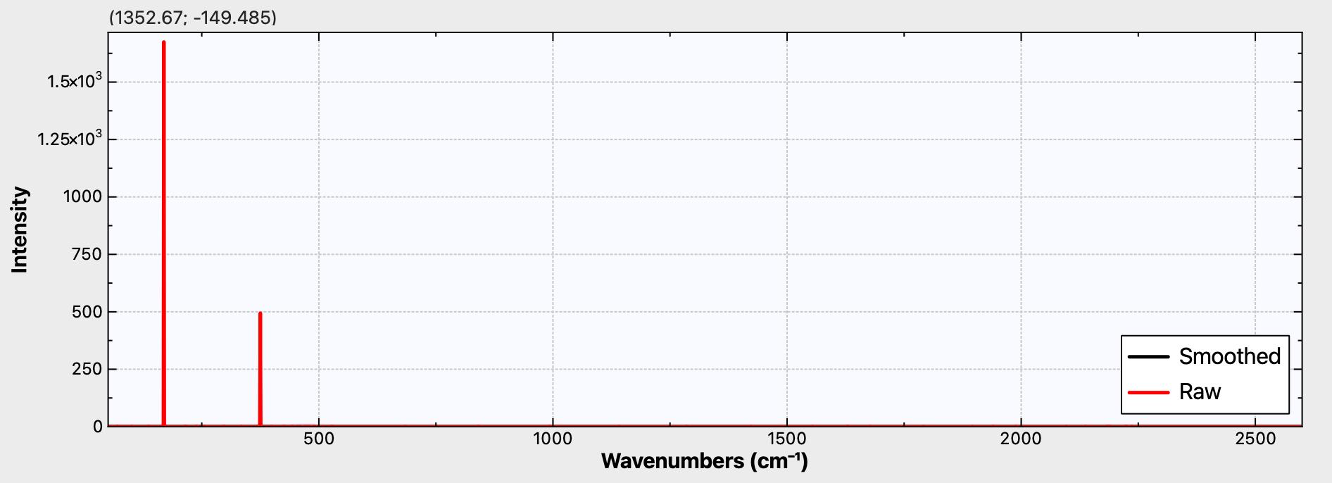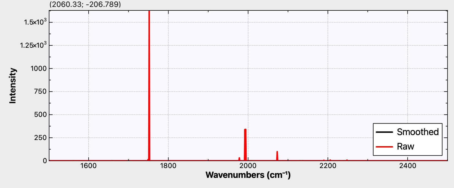 For C48, the measured activity as shown in figure 4c[1] is reproduced below (Figure 1a). Two modes are active, the A1g mode (the “kekule vibration“) and a less intense E2g mode. The OX B3LYP30 functional appears to reproduce this, with the values quoted in this figure (A1g 1959 and E2g 2058 cm-1 derived from scaling the OX B3LYP30 calculated values of 2088 and 2192 cm-1 reported in the supporting information data file by 0.9386). The r2-SCAN-3c functional likewise predicts the A1g mode (1752 cm-1, unscaled) to be more intense than E2g 1993 cm-1 (Figure 1b). Before we conclude which method is achieving the better result, the effect induced by the surrounding M3 ligands should be taken into account. We see in the table that the predicted CC bond length variation in the unmasked ring (0.0578) is slightly decreased in C48M3 to 0.0567, as are the bond lengths themselves (1.24839Å gas; 1.24699Å M3). The Raman modes in C48M3 (1767, 2013 cm-1) are calculated a little higher in wavenumber than C48 itself, but final assignment will depend on calculation of the Raman intensity, which is ongoing.