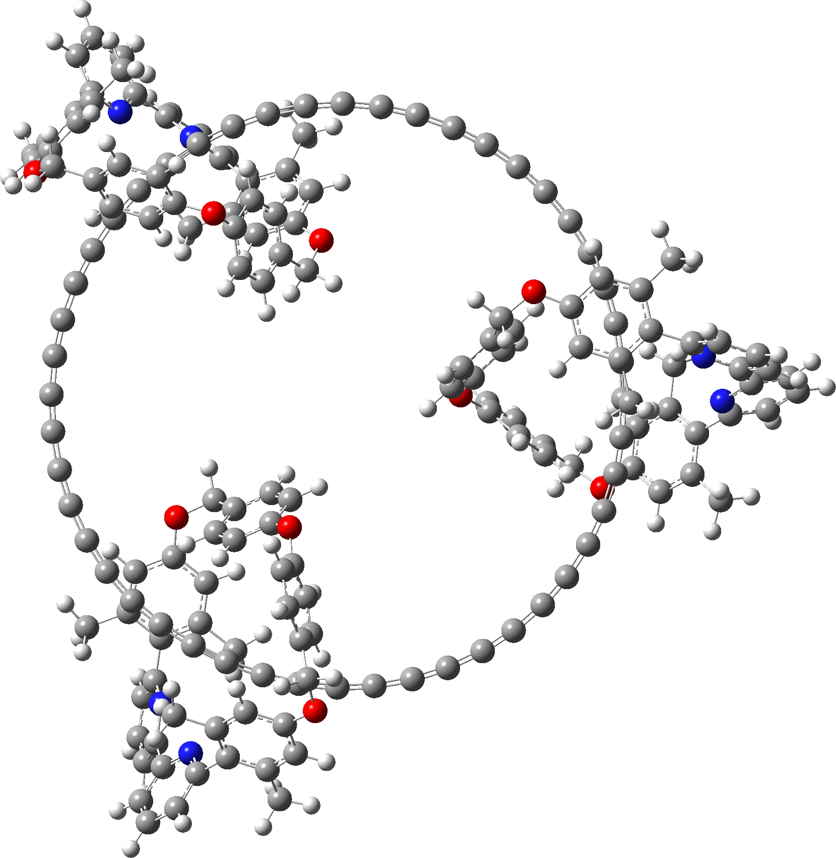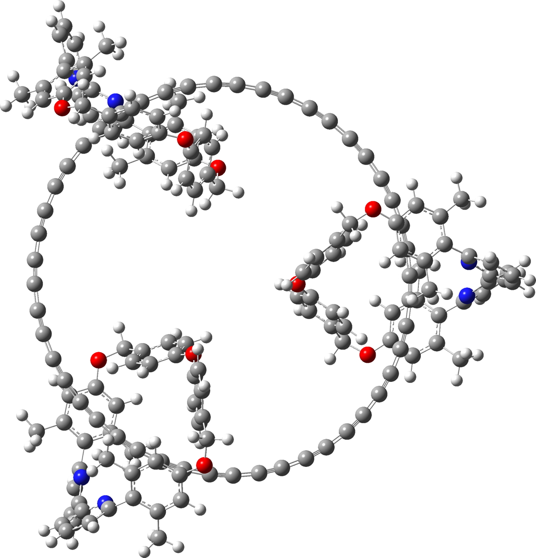 Here I also explore the recent r2-SCAN-3c functional,[5],[6] which importantly has NOT been adjusted, re-parametrised or scaled to achieve a particular result for these molecules and which – unlike the OX B3LYP30 method – also includes dispersion corrections.‡ Included in the table below are not only results for [18]-annulene and cyclo[48]carbon but two types of variation on the latter to test the scope of the functionals. The first was to include charged versions of C48, which reduce the electron count by either 4 (changing both the π- and σ- electron manifolds to a 4n+2 count) or by ±2 (changing just one of the manifolds to 4n+2). Also included are C14, C18, C46 (n=11; 4n+2 =46), C50 (n=12; 4n+2 =50), C58 (n=14, 4N+2=58), C62 (n=15, 4N+2=62) and C98 (n=24; 4n+2 = 98) which are all aromatic rings for which bond alternation should be much smaller, if it occurs at all. C60 is included as a larger 4n anti-aromatic molecule. It also proved possible to model the geometry of the full C48M3 catenane system as shown above using r2-SCAN-3c. FAIR data for the present calculations are published in a data repository.[14].