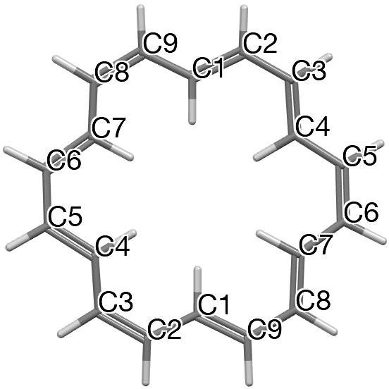 In my story about one of the molecules of the year, cyclo[48]carbon,[1] I noted that the DFT method used in the literature to model the C-C bond length alternation around the ring (OX B3LYP30[2]) had been re-calibrated against a remeasured crystal structure[3] of C18H18 or [18]-annulene (below) in order to reproduce the observed values for this molecule.