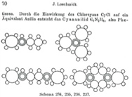This is where Loschmidt introduces the phenyl group, starting with 181, which shows alternating C=C and C-C allene structure, which he discounts, following on with the layered sausage formula, which he also discounts, and ending with 185, which is meant to represent the uncertainty in the structure. Contrast this hesitation with its absence for 239. Had he substituted N in this latter structure by CH, he would have achieved the modern formula. |