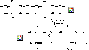Natural rubber was first introduced to Europe in the mid. 18th century - and is an example of an elastomer - an elastic polymer. A problem was that matural rubber is a very weak, soft thermoplastic when heated - but very brittle when cold. A process, vulcanisation, was invented by Goodyear, where rubber heated with sulphur produces a harder, less tacky elastic material. Here the long polymer chains are bonded together by sulphur atoms. The sulphur links gives the polymer a measure of rigidity - so that it does not undergo permanent change when stretched - and springs back to its original shape and size when the stress is removed.