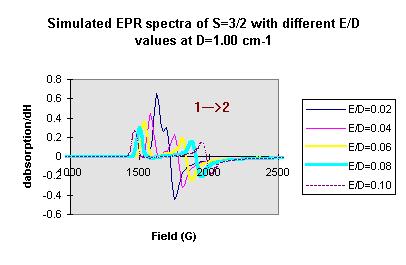 EPR spectra of different E/D values at S=3/2, D=1.0 cm-1 condition for 1