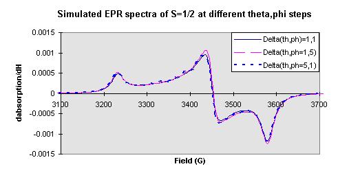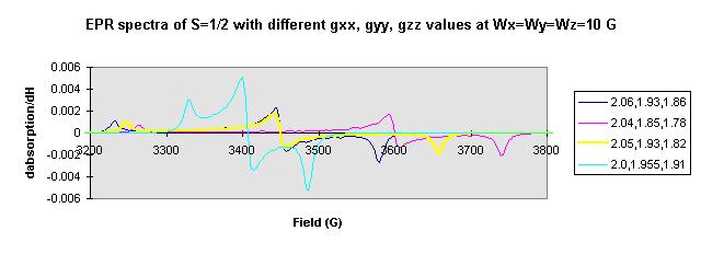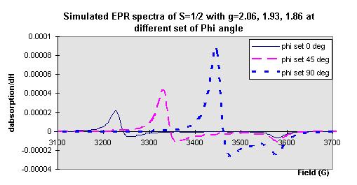 Figure 1 shows the simulated EPR spectra with different gxx, gyy, gzz values (for simple, g values selected as 2.1,2.0,1.9), and the g values in Figure 2 are from the reference elsewhere, actually, any given gxx, gyy, gzz values, the simulated EPR spectrum can be obtained. Figure 3 shows that the linewidth (Wx, Wy, Wz) also affect the shape of the signal, but the theta and phi steps do not much change the shape of the simulated EPR spectra (see Figure 4).