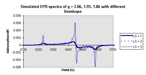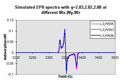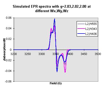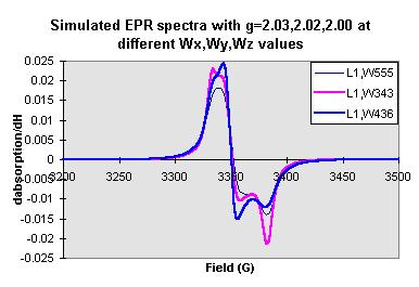 The lineshape (mixture of gaussian and lorentzian, gaussian, and lorentzian) is also affect the shape of the simulated EPR spectra (see Figure 9). If given the gxx, gyy, gzz values (for instance gxx=2.03, gyy=2.02, gzz=2.00), different Wx, Wy, Wz values selected are also affect the shape of simulated EPR spectra (see Figure 10,11,12).