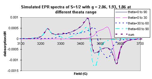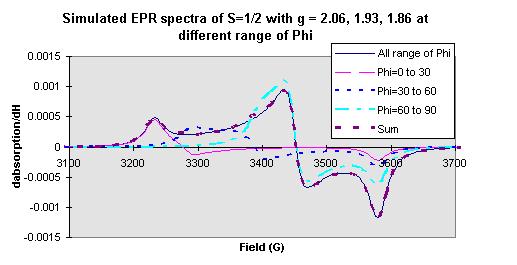 The same regularity is obtained when different range of Theta and Phi are set (see Figure 7): when the Phi range is set between 0 degree and 30 degree (Phi step is one degree, the same for other Phi ranges), the signal at ~ gxx is appeared; when the Phi range is set between 60 degree and 90 degree, the signal at gyy is appeared; when the Phi range is set between 30 degree and 60 degree, the signals at ~ (gxx+gyy)/2 are appeared. The siganl at gzz is independent of the change of Phi. When the Theta range is set between 0 degree and 30 degree (Theta step is one degree, the same for other Theta ranges), the siganl at ~ gzz is appeared; when the Theta range is set between 30 degree and 60 degree, the siganls at ~ (gyy+gzz)/2 are appeared; when the Theta range is set betwwen 60 degree and 90 degree, both siganls at gxx and gyy are appeared (see Figure 8).